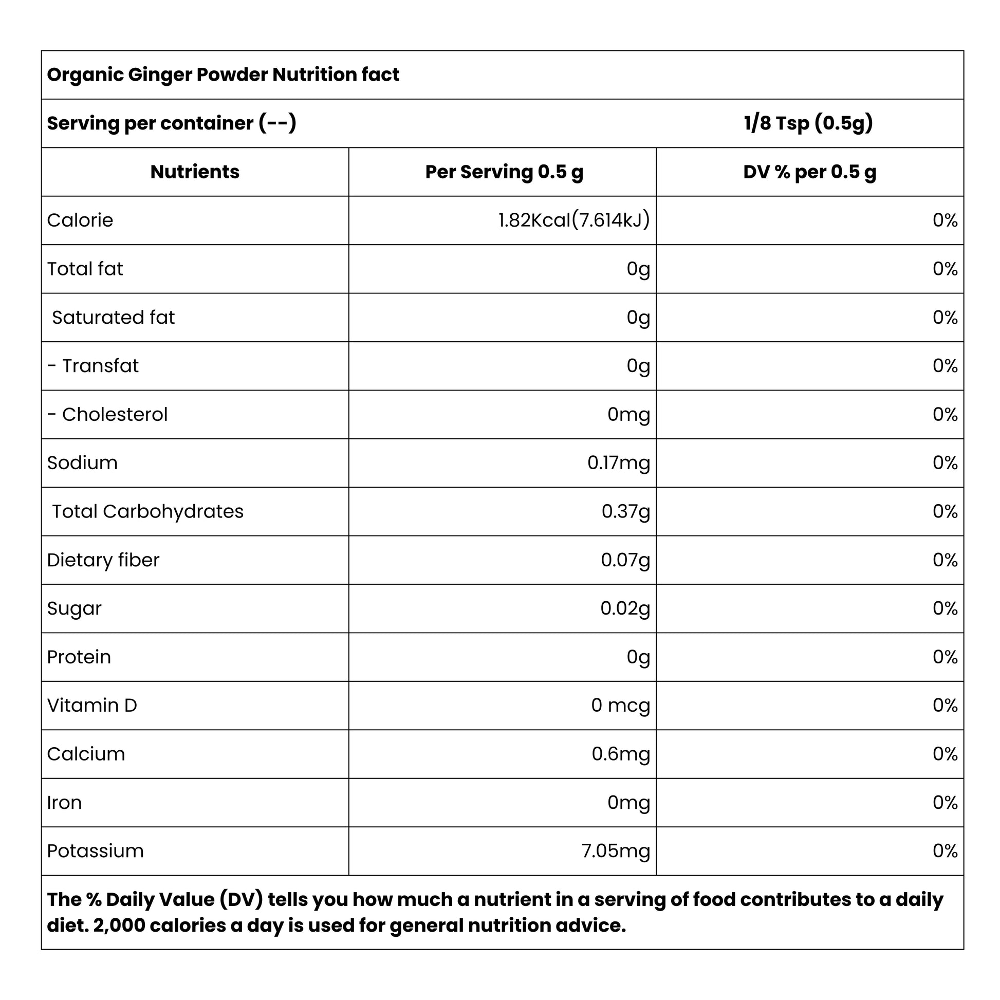 Organic Ginger Powder is a vibrant, aromatic spice made from pure, sun-dried ginger roots. Known for its potent anti-inflammatory and digestive properties, this natural powerhouse adds a warm, zesty flavor to your dishes while offering numerous health benefits. Perfect for teas, smoothies, and cooking, Organic Ginger Powder is a versatile staple that supports digestion, boosts immunity, and invigorates your overall well-being.