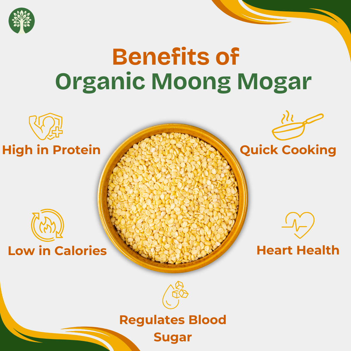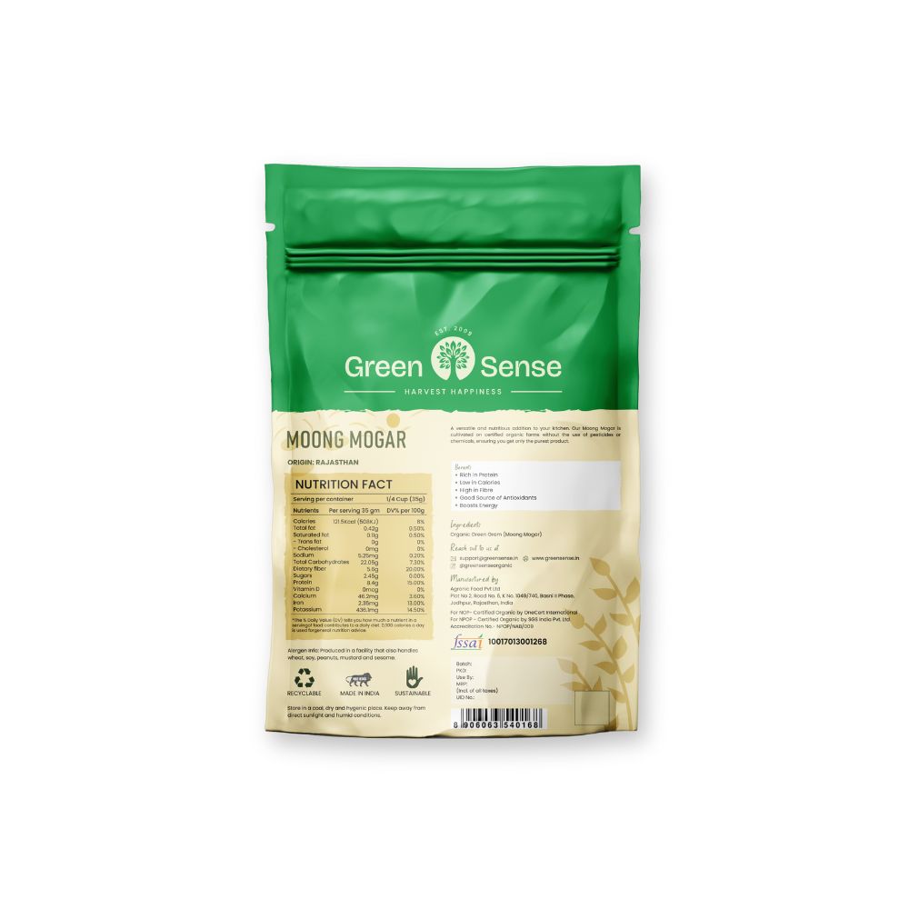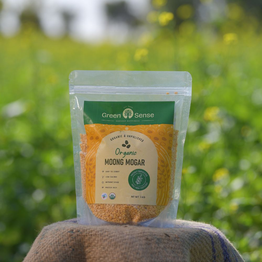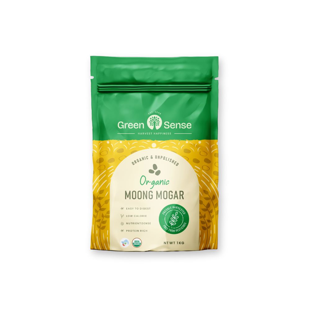Packed with protein and goodness, Green Sense Organic Moong Mogar Dal is made from 100% organically grown moong beans. Dehusked and split for easy cooking, this yellow lentil is a staple in Indian kitchens for its high nutritional value, easy digestion, and rich taste. Whether you're making dal tadka, khichdi, or a healthy salad, our Moong Mogar Dal is the perfect choice for a wholesome meal.