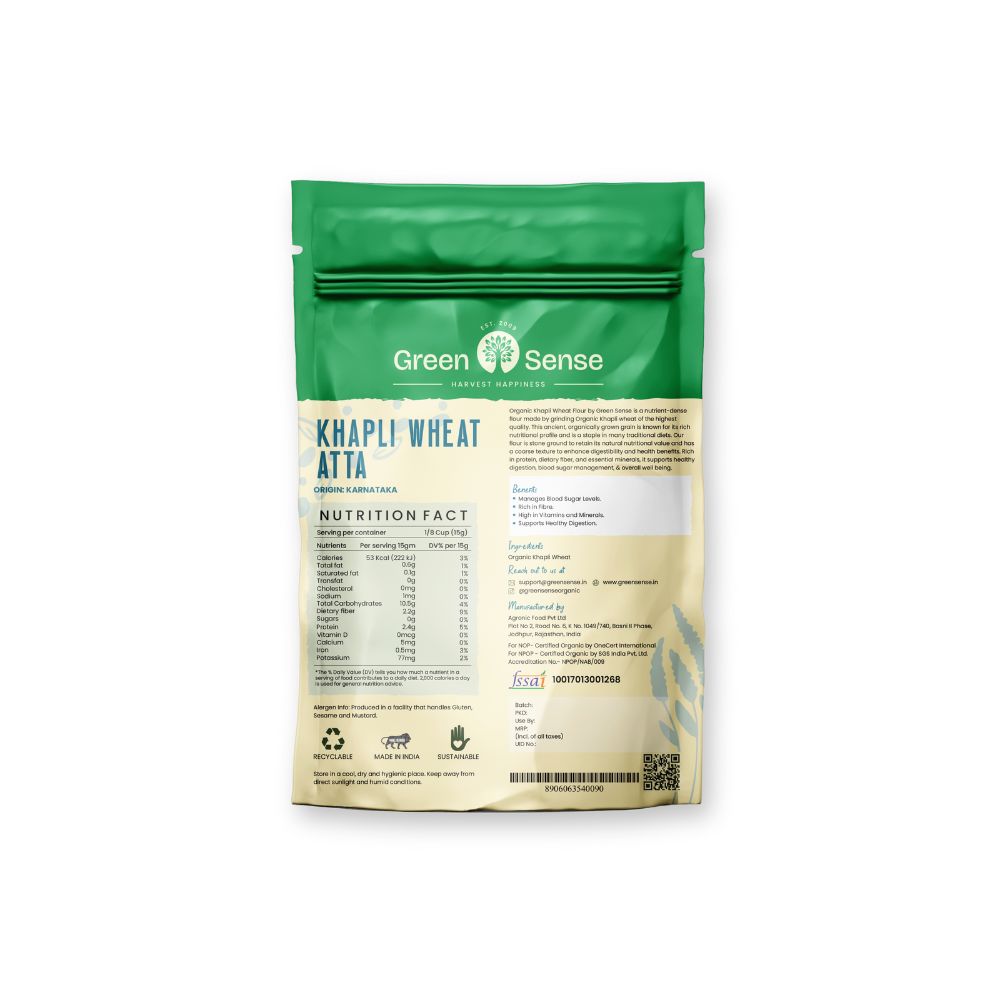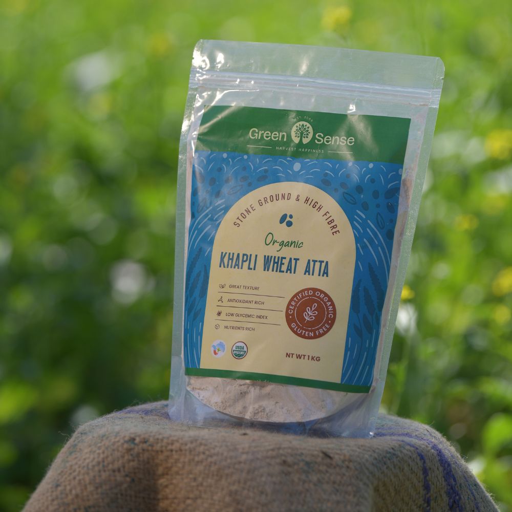 Organic Khapli Wheat Flour by Green Sense is a nutrient-dense flour made by grinding Organic Khapli wheat of the highest quality. This ancient, organically grown grain is known for its rich nutritional profile and is a staple in many traditional diets. Our flour is stone ground to retain its natural nutritional value and has a coarse texture to enhance digestibility and health benefits. Rich in protein, dietary fiber, and essential minerals, it supports healthy digestion, blood sugar management, and overall well-being. Ideal for baking and cooking, it’s a wholesome choice for health-conscious individuals.
