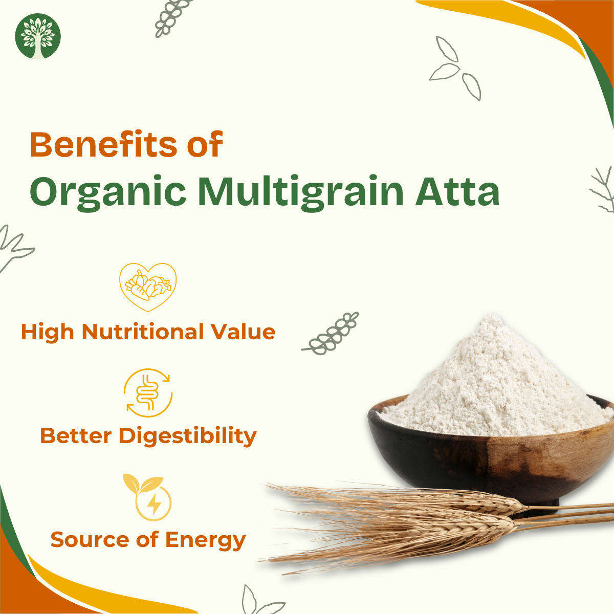 Green Sense Multigrain Atta is a nutritious blend of organically grown grains including wheat, barley, ragi, jowar, and oats. Rich in dietary fiber, protein, and essential nutrients, this flour supports better digestion and sustained energy. Ideal for making soft rotis, parathas, and healthy bakes, it's a perfect choice for health-conscious families.