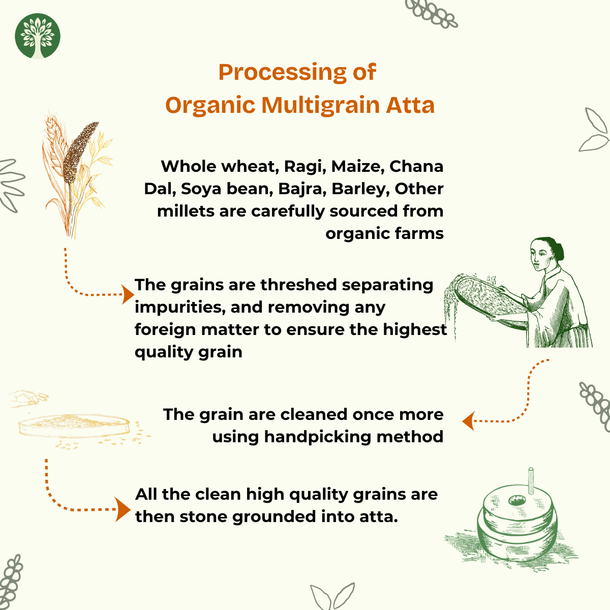 Endowed with multiple layers of goodness and benefits, Multigrain Flour is tasty and flavoursome. At Green Sense, we ensure high-quality organic grains are selected and cleaned under hygienic conditions, using state-of-the-art machines. The grains are then stone ground in slow speed by the cold process to preserve their natural aroma and texture. Organic Multigrain flour is a mix of barley, sorghum, finger millet, black gram, wheat, fenugreek, and psyllium husk.